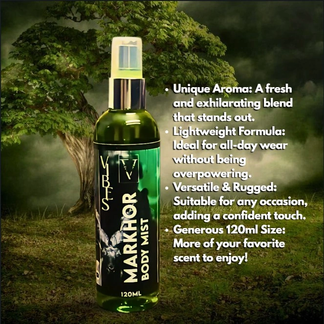 Discover the compelling allure of Markhor Body Mist from VIBES! This vibrant 120ml fragrance spray is your secret weapon for an instant burst of powerful freshness and rugged elegance. 🌬️ Its distinctive and refreshing scent is designed to envelop you in a halo of natural sophistication, leaving a memorable and appealing impression. Whether you’re in the city or exploring the outdoors, this body mist adds that touch of unique, masculine charm. ✨